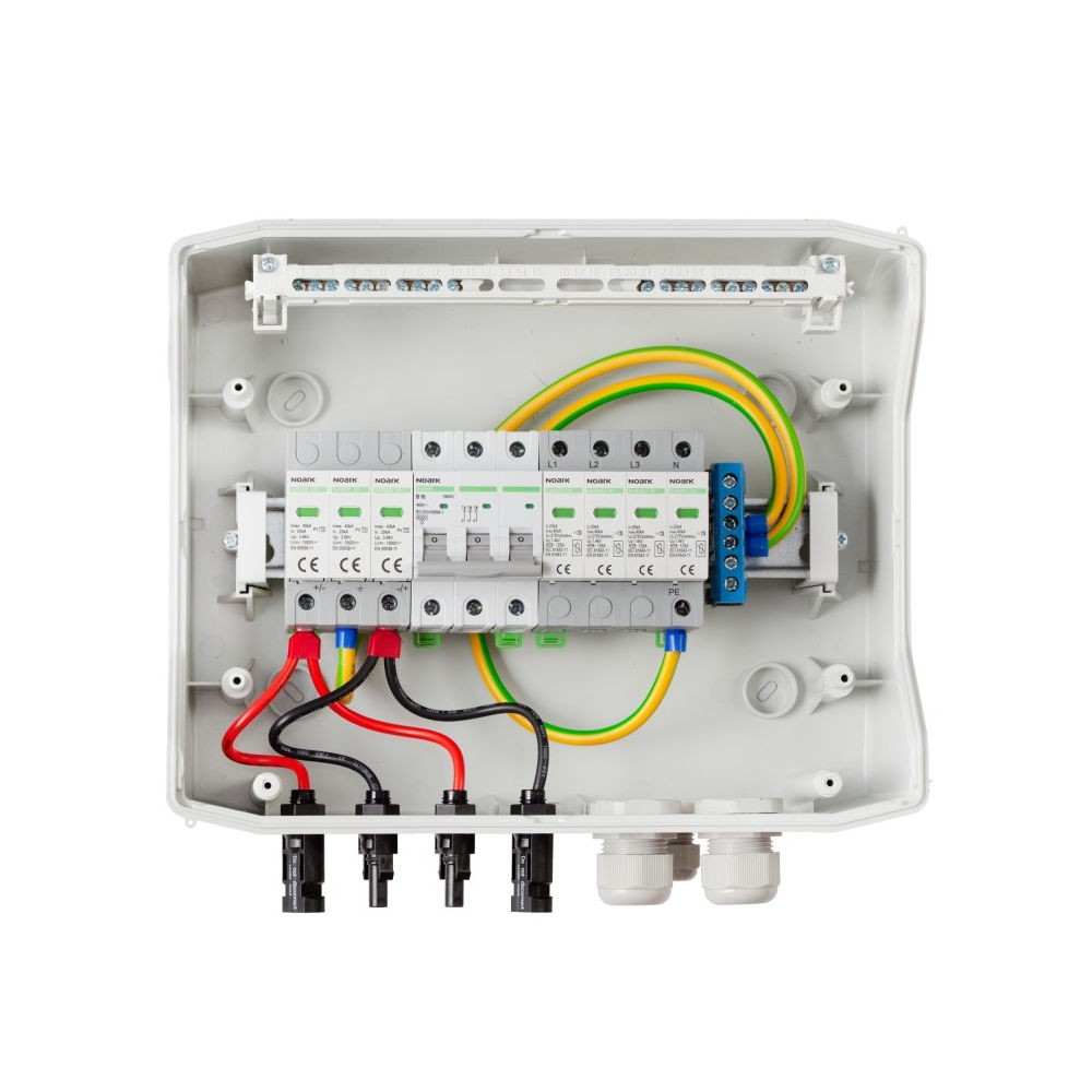 Rozdzielnica elektryczna ACDC T2 T2 zapewnia pełną ochronę obwodów AC i DC instalacji fotowoltaicznej przed skutkami zwarć. Jej konstrukcja nadaje się do montażu natynkowego. Dostawa składa się z obudowy, przezroczystych drzwi, szyn TH-35 mm, zacisków N+PE, przedniej pokrywy z wycięciami pod aparaty, dławików, zaślepek oraz elementów do montażu.